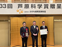 先月、かがわ産業支援財団から、香川県内産業の技術向上や振興に功績のあった個人・団体をたたえる「第33回芦原科学賞」の各賞の発表があり、このたび製造部の河野、赤松両名が「第33回芦原科学賞大賞」の栄誉に輝きました。
